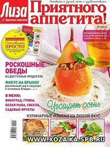 Журнал - «Лиза. Приятного аппетита!» для тех, кто любит готовить, печь и радовать близких кулинарными сюрпризами. Издание предлагает яркий аппетитный мир всем, для кого готовить — радость, а есть — удовольствие. Это журнал, целиком посвященный только одной теме — домашней кулинарии.